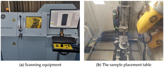 The equipment used for CT scanning was the Phoenix V|tome|x s series X-ray CT scanner from GE, Germany, as seen Figure 2a, which is able to perform observations down to 0.5 μm, and the sample placement table is shown in Figure 2b.