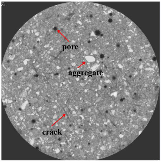 When scanning the specimen, the probe of the industrial CT scanning equipment emits X-rays, and the intensity of the X-rays after penetrating the concrete will be different because of the different X-ray absorption ability of the internal concrete material. After converting these light signals into digital signals, the horizontal and vertical slice information maps are obtained. Figure 3 shows the horizontal slice map the fiber dosage of which is 3 kg/m3. Through the slice map, the distribution of pores, cracks, and aggregates can be visualized, but the slice map can only reflect the two-dimensional structural information of the internal material and cannot realize the quantitative characterization, which needs to be further processed using reconstruction software.