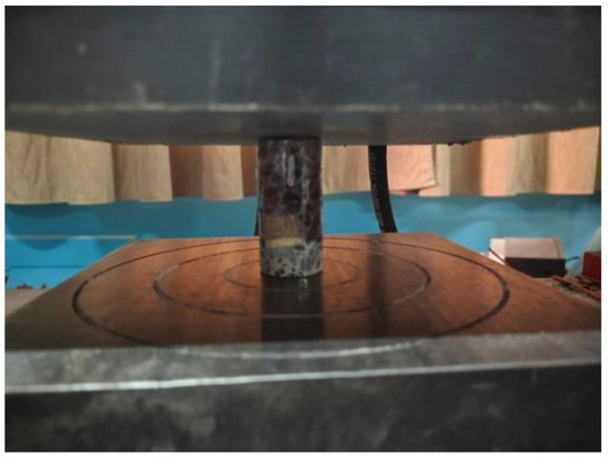 Basalt fiber reinforced concrete with each fiber content consisting of three-cylinder specimens, were tested on a WES-1000b electro-hydraulic universal testing machine in accordance with IS Code Standard and the Test Standard for Mechanical Properties of Ordinary Concrete (GB/T50081-2002) [12,13,25]. In the test results, the arithmetic mean value of 3 specimens was used as the compressive strength value of the group of specimens. If the difference between the maximum value and the minimum value and the intermediate value was not more than 15% of the intermediate value, the intermediate value was taken as the compressive strength value of the group of specimens. If the difference between the two values and the median value was greater than 15% of the median value, the group of test results was invalid. The placement status of the specimen on the universal press is shown in the Figure 4.