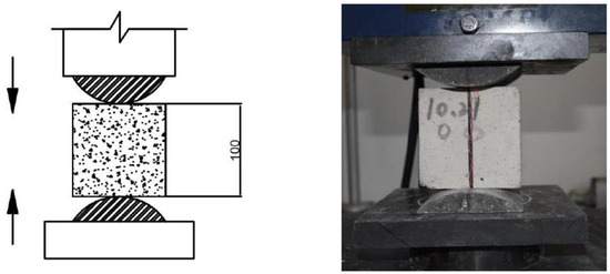 When the splitting tensile strength test was conducted for three groups of fiber reinforced concrete, the basalt fiber concrete with fiber content of each group contained three 100 mm cube specimens, which were carried out according to the standard of IS-5816 and the Test Standard for Mechanical Properties of Ordinary Concrete (GB/T50081-2002) [12,31,32]. The test strip adopted an 80 mm diameter steel arc-shaped cushion strip, the length of the strip was not less than the side length of the test piece. The wooden backing plate was placed between the cushion strip and the sample, the width of the backing plate was 20 mm, the thickness of 3–4 mm was not less than the side length of the test piece, and the backing plate could not be reused. See the Figure 5 for the loading diagram and the actual diagram.