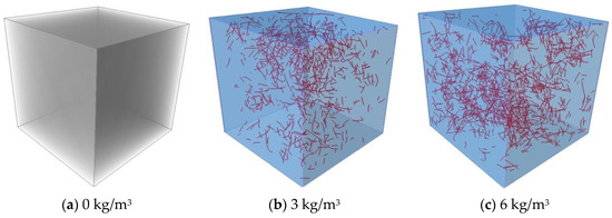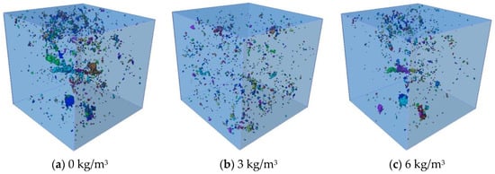 The model of fiber distribution in Figure 8 shows the fiber distribution at the fiber dosage of 3 kg/m3 and 6 kg/m3. In order to fully compare the three groups of specimens, the reconstructed part of the plain concrete is shown in grey, as in Figure 8a. Most of the fibers inside the concrete are distributed in an approximately horizontal state regardless of the fiber dosage, and the number of vertically distributed fibers is low. This feature is most evident at the fiber dosage of 6 kg/m3. In Figure 8b, the fibers are distributed in all directions, except for a few local areas where the distance between fibers is moderate and there is no obvious fiber agglomeration. In Figure 8c, the number of fibers increases, the fiber spacing decreases, and the proportion of fibers distributed horizontally increases significantly. Additionally, the phenomenon of fiber accumulation occurs in dense areas, while some areas are missing this phenomenon due to missing fibers.