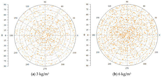 The fiber spatial distribution angles are represented in polar coordinates in the form of polar angles and polar diameters using the statistics of the two angles and φ in the model of fiber distribution, as shown in Figure 10. In Figure 10, the polar diameter is represented as and the polar angle as φ. By observing the density of the distribution of the points in the concentric circles, the uniformity of the distribution of the fibers on the horizontal plane can be obtained. The more uniform the distribution of the points in the concentric circles, the better the denseness of the mesh structure formed by the fibers. By observing the dispersion of the points inside the sector, the vertical distribution of the fibers can be obtained. The corresponding larger pole diameter indicates that the distribution state of fiber tends to be of a more horizontal distribution. From the distribution of points in Figure 10a,b, the fibers under both doping levels can form a dense mesh structure inside the concrete, and most of the fibers in the two groups of specimens correspond to greater than , indicating that most of the fibers inside the concrete are distributed in an approximately horizontal direction. Second, the distribution of all points in the two figures within each concentric circle area is not obviously missing, indicating that the basalt fibers are distributed in all areas inside the concrete. When the fiber dosage changed from 3 kg/m3 to 6 kg/m3, the distribution of points in Figure 10b appeared concentrated in some areas, which may cause the phenomenon of fiber agglomeration and crossover inside the concrete due to the increase of fiber dosage.