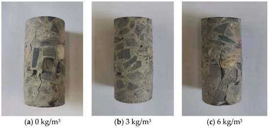 The uniaxial compression experiments were conducted on three groups of cylindrical specimens, and the damage morphology of the specimens is shown in Figure 11. By comparing the morphology of the three groups of specimens after being damaged, it can be seen that the crack distribution of the cylindrical specimens after being damaged is related to the level of fiber dosage. For the plain concrete, the surface peeling phenomenon is obvious when the specimens are damaged, and there are more cracks. At the same time, the crack distribution is usually concentrated on the interior of the peeling part, as shown in Figure 11a. However, the specimens mixed with basalt fibers are damaged and there are less cracks. The peeling phenomenon is not obvious. This performance is related to the level of fiber dosage, and the best effect is achieved at the fiber dosage of 3 kg/m3, where only short cracks appear on the surface of the specimens after destruction, as shown in Figure 11b,c [18].