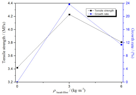 - When the fiber content is 3 and 6 kg/m3, basalt fiber can enhance the uniaxial compressive strength and the splitting tensile strength of the concrete. The reinforcement degree is related to the fiber content. The best fiber content is 3 kg/m3, and the increase rate of uniaxial compressive strength and splitting tensile strength is 23.7% and 31.9%, respectively;