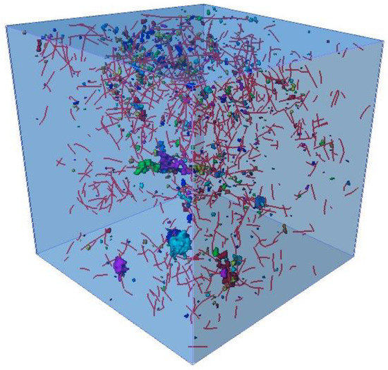 Taking the reconstructed area in the 3 kg/m3 specimen as an example, the distribution of pores and cracks and basalt fibers is reconstructed, as shown in Figure 9. It is clear from the Figure 13 that in the areas where the distribution of pores and cracks is more concentrated, the fiber spacing is smaller, and some of the fibers will cross the pores and cracks. When the concrete is subjected to the expansion of the cracks, the excellent tensile properties of the basalt fibers can be brought fully into play, and the fibers can effectively prevent the further development and expansion of the pores and cracks under this effect.