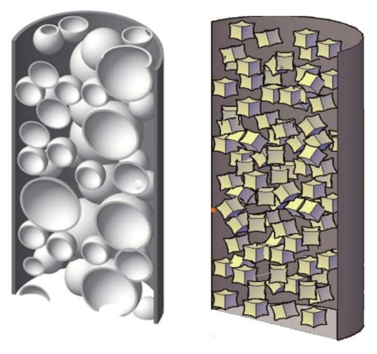 In the previous studies, author Pei-Shan Chen proposed a new type of lightweight concrete inspired by hollow bird bones, which is formed by mixing high-strength hollow bodies into the concrete, and named it bubble concrete [9,10,11,12]. The bubble concrete is different from foamed concrete and biaxial voided concrete slabs [13,14,15,16,17], because the hollow bodies not only create multiple cavities inside the concrete but also transmit stresses. The schematic diagram of bubble concrete is shown in Figure 1. The bubble concrete can reduce the density of concrete, improve the thermal insulation performance, and reduce the impact of seismic load on the concrete structure while ensuring the strength and Young’s modulus of concrete material. As this is a novel solution for lightweight concrete, authors have tried to extend it to other fields, for example, shipbuilding, metal materials, aerospace materials, etc.