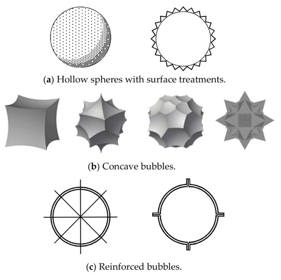 The shape and material adhesion of the hollow bodies significantly affect the strength of the bubble concrete, therefore, hollow body shapes in various approaches have been considered, as shown in Figure 2. Among them, Figure 2a indicates the roughening surface of the hollow bodies to increase the adhesion of the hollow body to the concrete, Figure 2b illustrates the inner concave hollow bodies to reduce the lateral expansion of the hollow bodies, and Figure 2c shows the hollow body using the wires and/or ribs to enhance the compressive strength.