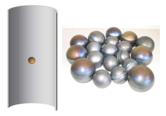 As shown in Figure 3, the concrete mold used in the concrete experiment was a cylindrical mold with a diameter of 150 mm and a height of 300 mm (Japanese standard) [24]. The hollow body was a hollow steel sphere that was produced with a steel plate of SS400 (yield point = 235 N/mm2), which was welded hemispheres. The steel spheres chosen for this experiment were 40 mm, 50 mm, 60 mm in diameter, 2 mm in thickness, and 60 mm in diameter, 3 mm in thickness. Then, five concrete specimens without steel spheres were made as controls.