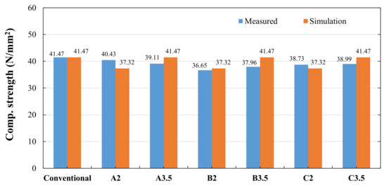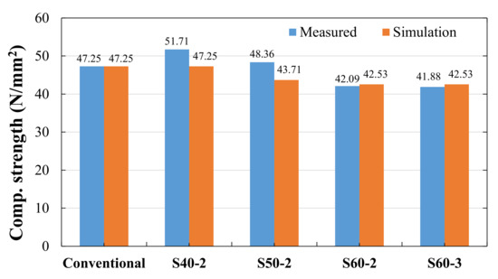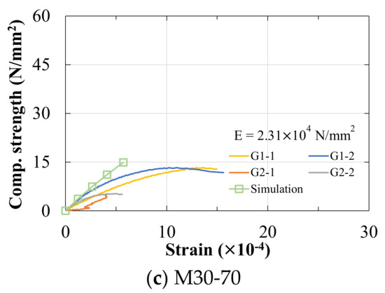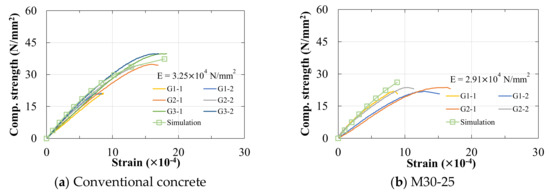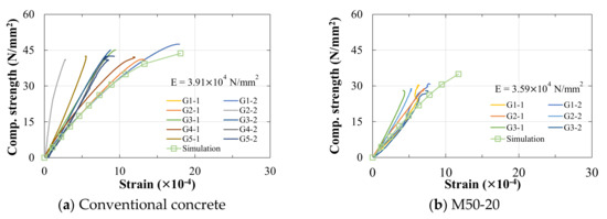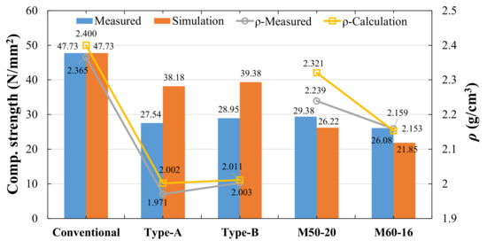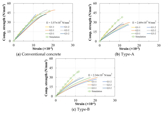 The density and strength of the concrete specimens are shown in Figure 30. The experimental strength of concrete is lower than the analytical strength, therefore, the strength of concrete can be improved up to analytical value by using appropriate methods. The average density of conventional concrete used for this experiment was 2.365 g/cm3, while the bubble concrete was 1.971–2.003 g/cm3. The average strength of conventional concrete was 47.73 N/mm2, while the average strength of bubble concrete was 27.54–28.95 N/mm2. Comparing the result with the randomly placed spheres (M50-20, M60-16) in Section 4.1, this type of bubble concrete could further reduce the concrete density by 6.3–13.3%. The stress–strain curve of the concrete is shown in Figure 31. Symbols G1-1, G1-2; G1-1, G1-2; G1-1, G1-2 are the strain gauges on the left and right sides of three concrete specimens. Similar to the previous experimental results, the incorporation of hollow bodies caused a tendency to decrease the strength and Young’s modulus of the concrete. However, the concrete of Type-B is slightly better than Type-A in terms of strength and Young’s modulus.