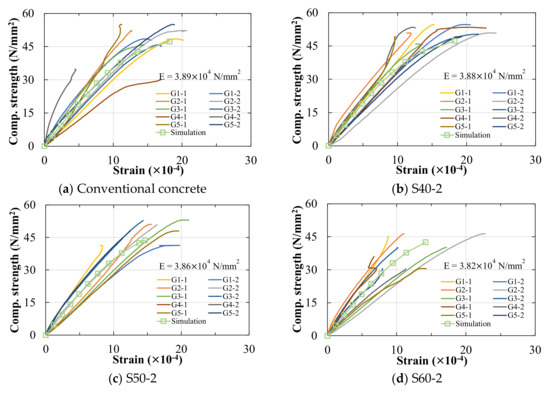 The stress–strain curves of the concrete specimens are shown in Figure 6. The horizontal axis is the compressive strain, and the symbols G1-1, G1-2; G2-1, G2-2; G3-1, G3-2; G4-1, G4-2; G5-1, G5-2 represent the strain gauge on the left and right sides of five concrete specimens, respectively. The increase in steel sphere diameter leads to a decrease in concrete Young’s modulus, while the thickness has no significant effect on Young’s modulus.