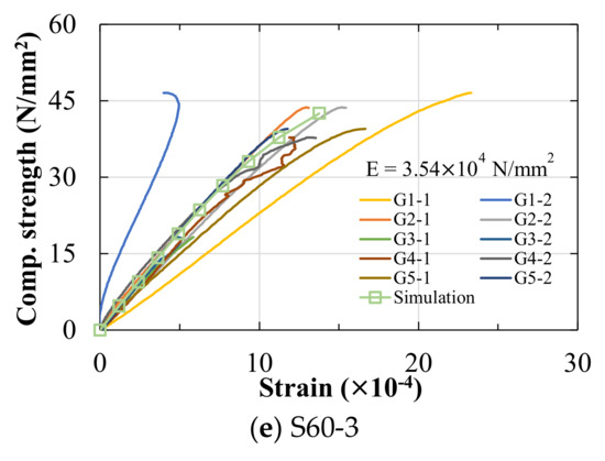 The stress–strain curve of concrete with multiple spheres. Notes: Subcaption of each figure (a–f) denotes: multiple spheres, diameter, and specimen number. The average Young’s modulus (E) is calculated based on 1/3 strength of the specimen.