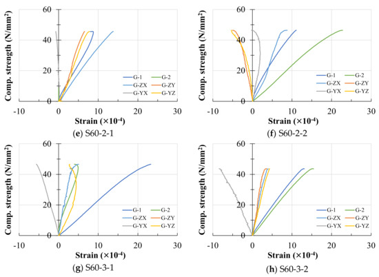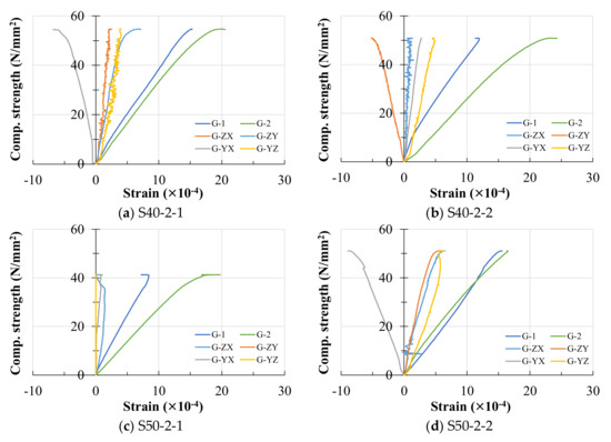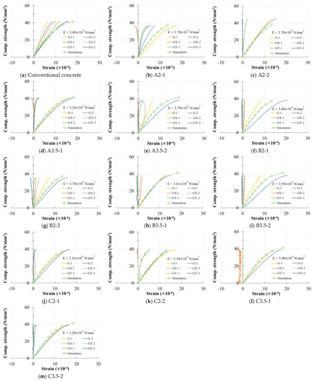 The strength of concrete specimens is shown in Figure 14. The strength range of the experiment was 36.65–40.23 N/mm2, which is similar to that when using a single sphere. The effect of depression and stress direction on the strength of the concrete was not noticeable. The stress–strain curves of the concrete are shown in Figure 15. The positive direction of the lateral coordinate represents the compression strain, while the negative direction represents the tension strain. The symbols G-1, G-2; GX-1, GX-2; GY-1, GY-2 represent the strain gauge on the left and right side of concrete specimens and the strain gauge of the concave body in the X and Y directions, respectively. Due to the poor welding quality and damage of some cubic concave bodies, some strain gauges failed to detect the strain inside the concave bodies (A2-2, C2-1, C3.5-1).
