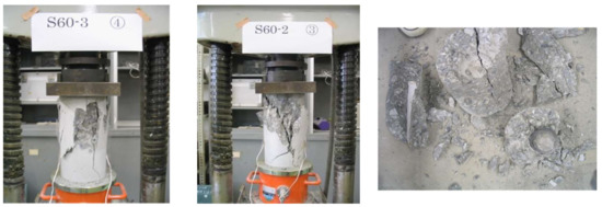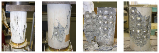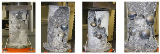 Moreover, based on the four sets of experimental results for M50-20, M50-40 and M60-12, M60-16, it is clear that the increase in steel sphere diameter also decreases the strength and Young’s modulus of concrete. The photos of the failed concrete are shown in Figure 21. Several cracks from top to bottom were generated in the concrete specimens, and severe peeling of concrete and spheres occurred. Part of the concrete was crushed, and then the concrete failed. The contact surface between the sphere and concrete was smooth, and no damage occurred in the spheres.