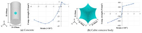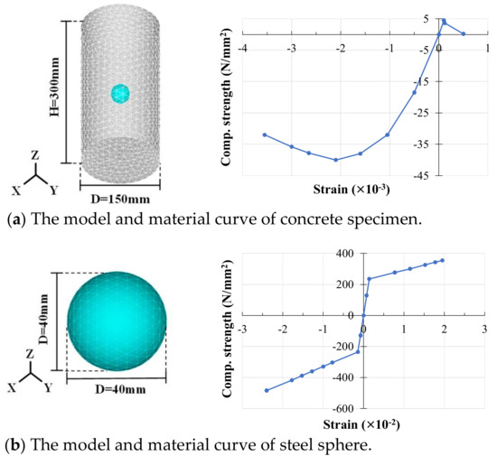 As the concrete experimental testing could not clearly show the stress distribution inside the concrete and sphere, nonlinear elastoplastic analysis for F.E.M. was adopted to analyze the bubbled concrete with a single steel sphere. The dimensions and material curves of the concrete and sphere model used for the analysis are shown in Figure 9. The sphere was placed in the center of the concrete, and a uniform load was applied at the top. In order to simulate the actual experimental conditions, the strength of concrete in each simulation was kept consistent with the strength of conventional concrete. The model was uniformly loaded and increased in ten steps, and then the strain and ultimate strength of the concrete were reached.