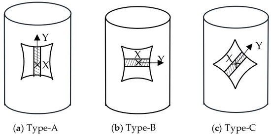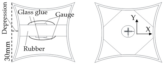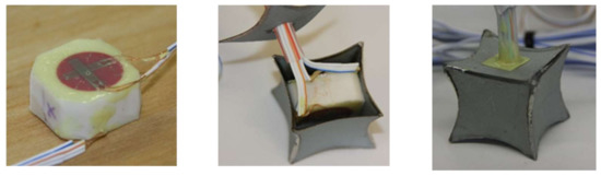 The material used for the concave body was the same as the steel sphere, which was SS400 (235 N/mm2). As shown in Figure 11, the cubic concave body had a side length of 30 mm and a thickness of 0.8 mm, and each face of the cube was recessed inward. The six faces were assembled by welding. An octagonal rubber was placed inside the concave body, and the strain gauges were attached to the center of the rubber to measure the inward strain generated by the concave body. The strain gauge was covered with glass glue to avoid breakage, and a hole was made on one side of the concave surface to lead out the strain gauge wire (Figure 12). As the stress direction and the depression of the concave body affect the concrete strength, the experiment was classified according to the depression and the direction of stress. As shown in Table 1, the concrete compression experiments were divided into six groups, and two concrete specimens were made for each group, and three concrete specimens not mixed with concave bodies were made as controls. Three orienting directions of the concave body, Type-A, Type-B, and Type-C, are shown in Figure 13.