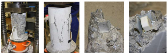 According to the failure modes of the concrete cylinder (Figure 16), the concave body produces an inward depression when it is subjected to stress. After the surface of the concave body was stripped from the concrete, it could not carry the load continuously. Then, the concave body lost its ability to transfer stresses, and the stresses were transferred to the surrounding concrete, causing an increase in stresses around the concave body. Moreover, the poor welding quality of the concave bodies caused damage to the concave body before the failure strength was reached, which contributed to the reduction in the ultimate concrete strength.
