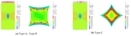 The analysis results of stress–strain are shown in the simulation curves in Figure 15. The results show that the orienting direction of the concave body has no obvious effect on the strength of the concrete. However, the increase in the depression would slightly increase the average strength of the concrete. The stress distribution diagrams inside the concrete are shown in Figure 18. The concave body is compressed inward and prevents the generation of outward expansion. Therefore, the stress of concrete around the concave body is less than the stress when a sphere is used. After the side edge of the concave body is subjected to stress, stress concentration occurs, causing the model to deform. Moreover, since the thickness of the concave body is 0.8 mm, the concave body deformed very quickly and then peeled off from the concrete.