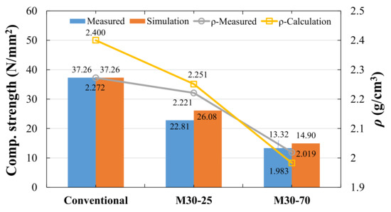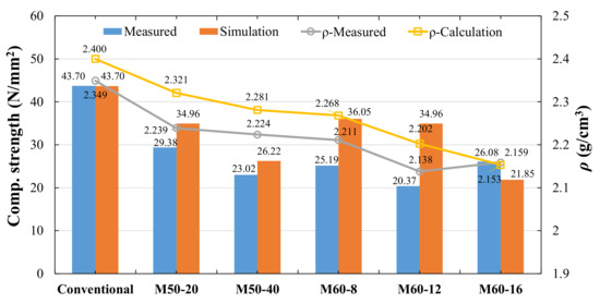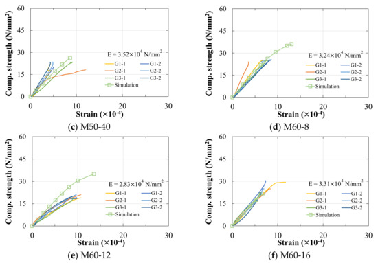 The density and strength of the concrete specimens are shown in Figure 19. The experimental strength of concrete is lower than the analytical strength, but as the number of steel spheres increases, the experimental value and the analytical value gradually decrease, and the experimental strength is even higher than the analytical strength (M60-16). The average density of concrete without spheres mixed in was 2.349 g/cm3, while the average density of bubble concrete was 2.159–2.224 g/cm3. The average strength of the specimens without steel spheres was 43.7 N/mm2, while the average strength of the bubble concrete was 25.19–29.38 N/mm2. The stress–strain curves of the concrete specimens are shown in Figure 20. The concrete Young’s modulus gradually decreases with the increase in the number of steel spheres.