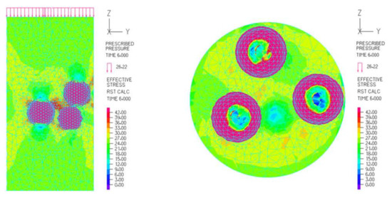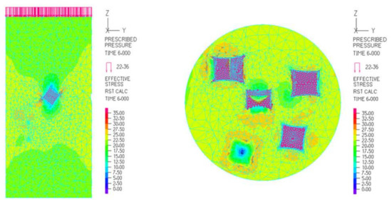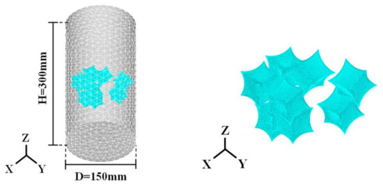 The bubble concrete model with multiple concave bodies is shown in Figure 27. The concave bodies were randomly placed in the concrete and parsed with the same method as before. The internal stress diagram of the bubble concrete is shown in Figure 28. In general, the stress characteristics of the concave bodies are similar to those when steel spheres were used. However, the deformation and stresses generated in the lateral direction are smaller than those when spheres are used.