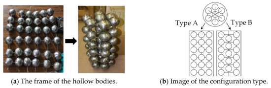 Figure 29a shows the steel spheres connected with thin wires to form a hollow body frame. The dimensions of the concrete model were the same as in the previous sections. The sphere’s diameter was 40 mm, the thickness was 1 mm, and the distance between neighboring spheres was about 10 mm. As shown in Figure 29b, two types of hollow body frames were made for the experiment. For the Type-A frame, hollow bodies were arranged in the same level with seven spheres in each layer, while the Type-B frames had six steel spheres fixed at the outer side and one fixed at the center between two layers. Three concrete specimens were made for each type of hollow body frame, and three concrete specimens without steel spheres were fabricated for control. The concrete strength used for the experiments was Fc = 40 N/mm2; the diameter of aggregate was less than 10 mm; water reducing agent was mixed in a ratio of 5.4 kg/m3, and slump flow was 50 cm. The concrete specimens were filled in three times, vibrated at the bottom and sides using a vibrating rod, and placed in water for 28 days for curing.