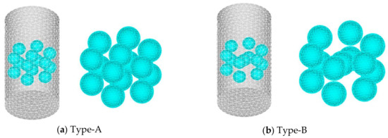 In order to investigate the effect of mixing a number of hollow bodies on the density, compressive strength, and Young’s modulus of the bubble concrete, this section describes the bubble concrete mixed with multiple spheres and cubic concave bodies. Compression experimental testing and numerical simulations were carried out for the study, while the experimental and analytical methods were the same as those in Section 3.