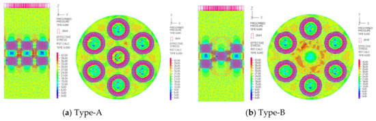 The analysis results of stress–strain curves are shown in Figure 6. The analytical results show that the simulated value of concrete strength is close to the experimental value. The increase in the diameter of spheres would cause a slight decrease in the concrete strength and Young’s modulus. The internal stress distribution of the concrete is shown in Figure 10. With the increased loading on the top of the concrete, significant stress is generated on the sphere surface, and it is concentrated near the equatorial line. The steel sphere undergoes compression in the vertical direction and expansion in four oblique directions after being subjected to the stress. The vertical deformation of the sphere leads to a reduction in stresses. The oblique deformation of the sphere, on the other hand, squeezes the surrounding concrete, leading to an increase in the stresses.