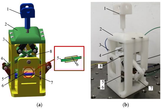 Structure of the micro-power piezoelectric generator. (a) 3D model; (b) prototype. (1) Telescoping rod; (2) cover; (3) body case; (4) displacement amplifying mechanism; (5) flexure strip; (6) MFC piezoelectric films; (7) position-limit mechanism; (8) fixed pin.