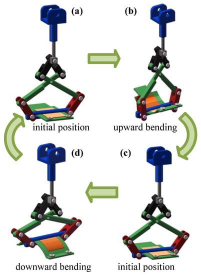 Step 2: When the time is at the period of T/4, the telescopic rod moves to the top position, and its amplitude comes up to δm. The displacement amplification mechanism is elongated. At this point, the limiting mechanism moves down to the lowest end. Driven by the limiting mechanism, the flexure strip with piezoelectric MFC films is bent upward and deformed.
