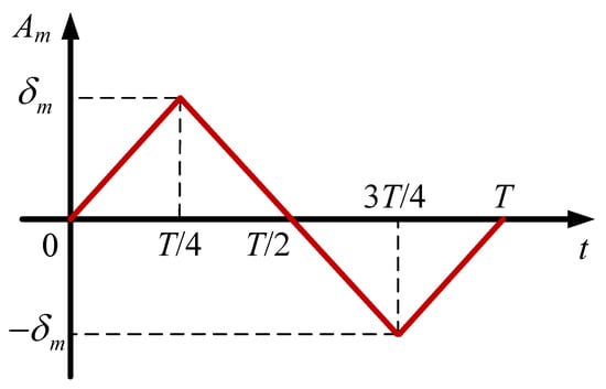 Figure 2 presents the working principle of the micro-power piezoelectric generator. For one motion period, the generating unit can achieve upward bending and downward bending movements. The excitation signal applied to the telescopic rod is a triangular wave signal, as shown in Figure 3, where δm is its amplitude. The detailed operation steps are as follows: