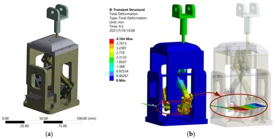 Figure 4 shows the process and results of FEA for the generator, where Figure 4a is the meshing model, while Figure 4b presents the deformation results of the generator under excitation displacement of 2 mm. The free meshing method was used to meshing the structural model with a mesh size of 0.5 mm. After meshing, a total of 152,800 nodes and 619,371 meshes were obtained. Then, displacement loads are applied to the telescoping rod of the piezoelectric generator. Here, the magnitude of displacement load is 2–10 mm respectively. Finally, the statics were solved, and the deformation results can be observed. By changing the magnitude of the applied displacement load, the deformation displacement of the flexure strip can be obtained, as shown in Table 2.