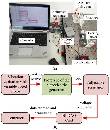 Experimental test system of the micro-power piezoelectric generator. (a) Test platform; (b) experimental schematic diagram.