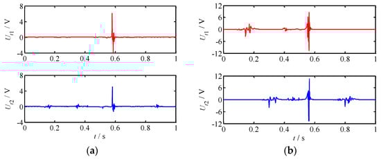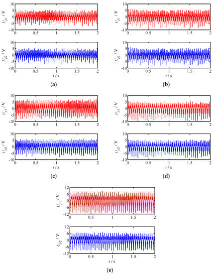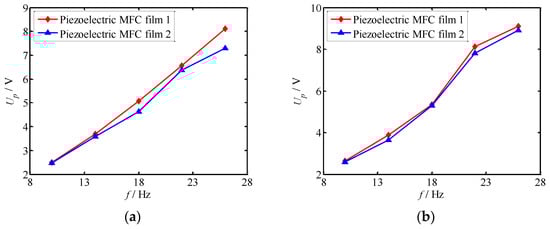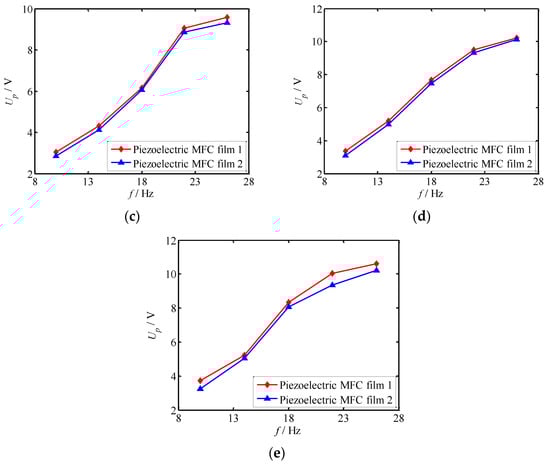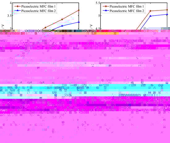 The results of output voltage are shown in Figure 10 and Figure 11. In order to observe the difference of the output voltage of the two piezoelectric MFC films, the output error of the two piezoelectric plates was solved, which is shown in Table 4. From the figures and table, it can be obtained: