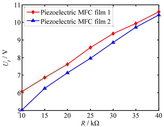 When the load resistance was constant, the peak values of the output voltage of the two piezoelectric MFC films were close at the same exciting frequency. When the excitation frequency was constant, the peak voltage increased with the increase of load resistance.