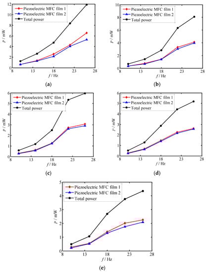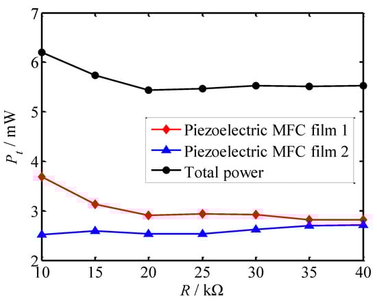 - The variation of the total power with excitation frequency is the same as that of the output power of a single piezoelectric MFC film with excitation frequency. The maximum total power occurs when the load resistance is 10 kΩ, and the excitation frequency is 26 Hz, with a maximum of 11.9 mW.