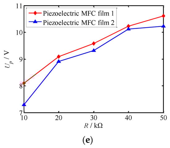 In conclusion, the output voltage of the piezoelectric generator varies in direct proportion to the excitation frequency and the load resistance. Under the same external conditions, the peak values of the output voltage of the two piezoelectric MFC films are close to each other.