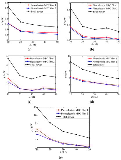 (1) When the load resistance is constant, the output voltage of the two piezoelectric MFC films of the proposed micro-power generator increases non-linearly with the increase of the excitation frequency. The larger the resistance is, the more significant the nonlinear variation of voltage with frequency is.