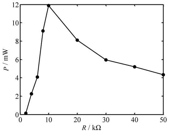 According to the above analysis, the reason for selecting 10–50 kΩ as the load resistance variation range is that when the load resistance increased to 50 kΩ, the output voltage of the micro-power piezoelectric generator reached its maximum value, and it was meaningless to expand the research range further. In addition, the range of 10–50 kΩ was sufficient to summarize the variation rule of the output voltage and output power of the micro-power piezoelectric generator.