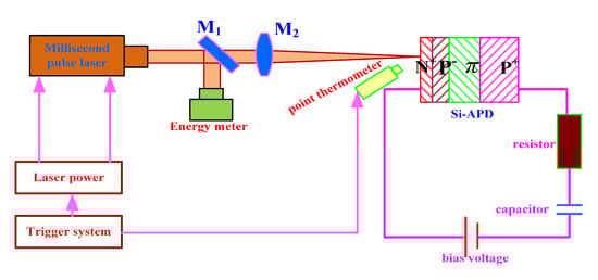 Figure 1 is the experimental device for the measurement of the temperature rise in a Si-APD irradiated by a millisecond pulse laser. The device is mainly composed of a laser system, a point thermometer, and a Si-APD external circuit. A Nd:YAG millisecond pulse laser with a pulse width was 1.0 ms and a wavelength of 1064 nm is used. The laser irradiates the surface of the detector vertically, and the focus is located on the surface of the detector. The point temperature meter and the optical axis of the laser are placed at 45 degrees, which can effectively avoid the influence of the laser on the measurement accuracy of the point temperature meter. The emitted laser beam is divided into two parts by a beam splitter. One part of the laser beams is focused on the APD surface through a lens, the energy of the other part is monitored by an energy meter, and the ratio of laser energy incident on the surface of the Si-APD detector and energy meter is 10:1. The diameter of the focusing spot is 360 μm. The laser and the point temperature meter are triggered by the same trigger, which can ensure that the point temperature meter begins to measure the temperature at the moment when the laser starts to irradiate, to ensure the synchronicity of the laser-irradiated Si-APD and the point temperature meter. In the experiment, we used a laser frequency of 1 Hz. It is simply a one shot–one temperature measure. The Si-APD external circuit is composed of a 180 V-bias voltage source, capacitor, resistor, and Si-APD. In the experiment, 1 μf and 47 pf capacitors were connected in series in the bias circuit. The Si-APD (the commercial specification is Ø800, made in China) used in the experiment was the N + P − πP+ type, with a layered structure, which is composed of four layers, and the doping distribution and thickness of each layer are different. The doping concentrations of each layer are 5 × 1019 cm−3, 5 × 1016 cm−3, 5 × 1012 cm−3, and 1 × 1019 cm−3. The corresponding thicknesses are 1 μm, 3 μm, 50 μm, and 250 μm.