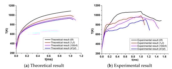 When the pulse width is 1.0 ms, energy density is 15 J/cm2, and theoretical and experimental temperature rise characteristics of the Si-APD in different capacitor driving circuits are shown as Figure 2. Additionally, the system parameters used in the theoretical simulation are as follows: 330 − 2.19 10−2 T (kgm−3), specific heat C = 352.43 + 1.78 T − 2.21 10−2 T2 + 1.3 10−6 T3 − 2.83 10−10 T4 (Jkg−1), k = 22.23 + 422.52 exp(−T/255.45) (Wm−1−1).