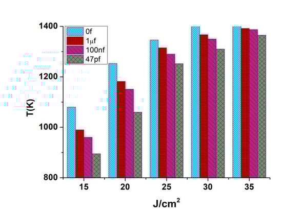 Based on the study of the temperature rise process under different external capacitance conditions, the maximum temperature rise in the Si-APD surface under different external capacitance conditions was investigated by changing the laser energy density. The experimental results are shown in Figure 3.