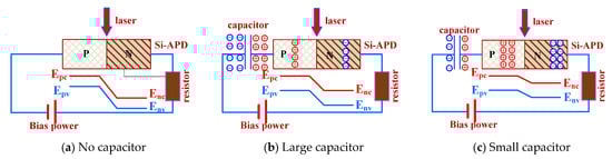 As shown in the figure, when the laser energy density is constant, the maximum value of the temperature rise without a capacitance is higher than that with a capacitance. When the driving circuit is connected with different capacitors, the maximum temperature rise will be significantly affected. The smaller the capacitance in the driving circuit, the lower the maximum temperature rise on the detector surface. That is to say, the maximum temperature rise on the detector surface is inversely proportional to the capacitance value. To better understand this, we studied the mechanism by analyzing the carrier transport process. Figure 4 shows the internal mechanism for the influence of the different capacitances on the maximum surface temperature rise in the Si-APD. The case without capacitance is shown in Figure 4a, the barrier between PN junctions in the Si-APD is highest under the action of a reverse bias voltage, and a high electric field intensity area is generated in the depletion layer. When the millisecond pulse laser irradiates the Si-APD, the photocarriers generated in the Si-APD are swept away rapidly under the action of high electric field intensity, which results in a large transient current. As Joule heat is the product of electric field intensity and current density, more Joule heat will be generated in the Si-APD when the electric field strength and current density become large simultaneously. However, when a capacitor is connected in series in the circuit, the charges in the circuit will gradually accumulate on both sides of the capacitor plate, hindering the current in the circuit. In this way, the photogenerated carriers in the Si-APD cannot flow into the external circuit smoothly. The carriers accumulate on both sides of the PN junction, forming an additional potential that is opposite to the original potential. This additional potential and the original potential cancel each other out due to the opposite direction, resulting in a decrease in the internal total electric field. Thus, the current density and electric field intensity decrease simultaneously, which reduces the Joule heat. At the same time, it can be seen from Figure 4b,c that the smaller the external capacitance, the weaker its ability to store charges, thus the stronger its ability to block the current in the circuit. At this time, a larger additional potential is formed on both sides of the PN junction, which makes the current density and electric field inside the Si-APD smaller, resulting in less Joule heat. In other words, the Joule heat inside the Si-APD is positively proportional to the capacitance. Therefore, the maximum surface temperature rise in the Si-APD decreases with the decrease in capacitance in the circuit.