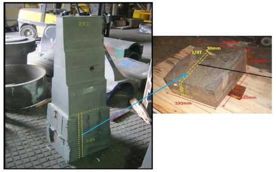 Table 1 illustrates the nominal chemical composition (wt.%) of Haynes 282. The materials studied in this research were cut from a thick section (the most segregated region) of a large step cast (900 mm in height) produced by traditional sand casting by Goodwin Steel Castings Limited. The sizes of the received materials are shown in Figure 1.