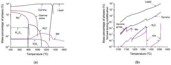 The calculated equilibrium phase diagram and solidification sequence of Haynes 282 are illustrated in Figure 2a,b, respectively. Liquid, γ, γ’, MX, M23C6, M6C, M3B2 and µ phase were predicted both in the equilibrium state and during solidification. During solidification, the first solid to form from the liquid was in the form of γ dendrites. During continuous cooling, γ dendrites continued to form, and a series of compositions was observed due to segregation during solidification. At the same time, solute elements with a partition coefficient k > 1 were rejected into the interdendritic liquid at the dendrite/liquid interface. Continued solute enrichment in the interdendritic liquid could have caused the solubility limit of the primary γ to be exceeded, and consequently, secondary solidification constituents were formed between the dendrites.