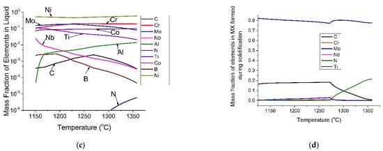 From Figure 2b, it can be seen that there were two stages of MX precipitates. The composition of MX during solidification was also calculated and is shown in Figure 2d. As shown in Figure 2d, MX precipitates formed during solidification can be grouped into two types: Ti-rich carbo-nitrides formed above 1270 °C, and Ti, Mo-rich carbides formed below 1270 °C.