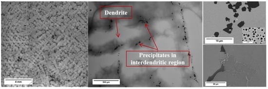 Microstructural overview of the AC sample. From left to right: an overview of huge grains and dendrites; interdendritic precipitates; randomly distributed MX precipitates and blocky grain boundary MX precipitates. The inserted image is a micrograph of γ’.