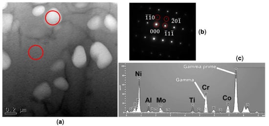 Phase identification of γ’ precipitates: (a) a TEM micrograph of γ’; (b) a superlattice diffraction pattern of γ’ and (c) compared EDS spectra of the γ matrix and the γ’ particle.