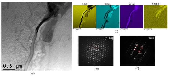 From the image of blocky grain boundary MX in Figure 3, it can also be seen that the grain boundary was fully covered by small precipitates. A highlighted TEM micrograph of these precipitates is shown in Figure 5a, in which dark and bright precipitates can be seen. The EDS maps in Figure 5b show that the dark precipitates were Cr-rich carbides, and the white precipitate were Mo-rich particles without C. Diffraction patterns of the white and dark precipitates are illustrated in Figure 5c and d respectively; they proved that the white precipitate was µ phase with a rhombohedral lattice parameter of a = 0.47 nm and c = 2.56 nm, and the dark precipitate was M23C6 phase with a lattice parameter of 1.06 nm.
