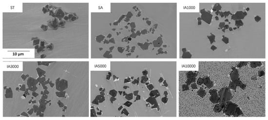 Since the size of the MX in the IA10000 sample was larger than that in the AC sample, the reduced content of Mo in the IA10000 sample has not been attributed to MX decomposition. Micrographs in Figure 6 were taken in backscatter mode; elements with a larger atomic number will be brighter under contrast. From the ST image in Figure 6, it can be seen that there were two regions in the MX precipitate and that the middle region was darker than the edge region. This result indicated that the element in the middle region was lighter than that in the edge region. Therefore, the middle region was more Ti-rich and the edge region was more Mo-rich. However, as seen in the IA images in Figure 6, it was difficult to find two regions in the MX precipitates, while there were white precipitates formed around MX. These results indicated that the Mo element diffused out from MX to form other phases during isothermal aging. Therefore, it was the diffusion of Mo from the MX particle to form other phases that accounted for the reduction of Mo in the MX in the IA10000 sample.