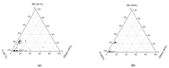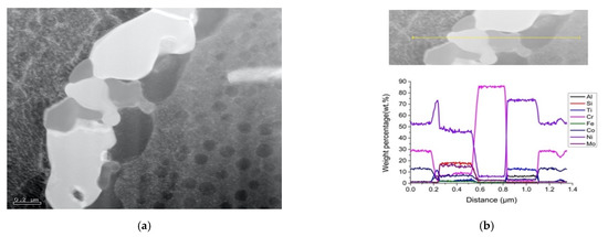 However, as shown in Figure 6, some white precipitates formed around the MX during isothermal aging. The composition of MX precipitates was quantified for the AC sample and the IA10000 samples, as illustrated in Figure 7a,b respectively. There were two types of MX precipitates: TiN and (Ti, Mo) C. The (Ti, Mo) C precipitates in the AC sample had a more scattered chemical composition distribution than those in the IA10000 sample. This result demonstrated that, in the IA10000 sample, MX precipitates had less Mo content than in the AC sample. There are two possible reasons for this phenomenon:
