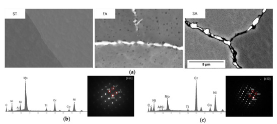 (a) Micrographs of grain boundary precipitates in ST, FA, SA condition; (b) EDS spectra and a diffraction pattern of white precipitate in FA sample; (c) EDS spectra and a diffraction pattern of dark precipitate in SA sample.
